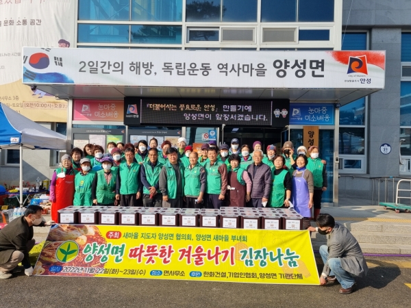 김향자 양성면 새마을부녀회장은 “오늘 김장나누기 행사는 새마을부녀회에서 주도적으로 추진했으나 뒤에서 후원해 주신 분들이 없었다면 제대로 하지 못했을 것”이라며 “오늘 행사를 잘 치를 수 있도록 후원해 주신 모든 분들과 우리 새마을부녀회원 여러분께 다시 한번 깊이 감사드린다”고 말했다.