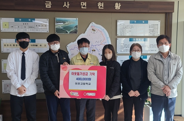 이어 지난 24일 이포고등학교 학생들이 이웃돕기 바자회 및 까페 운영 수익금 40만원을 금사면행정복지센터를 방문해 어려운 이웃을 위해 사용해 달라며 전달했다.