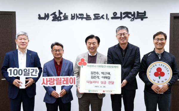 [금요저널] 의정부시는 11월 24일 김진수, 박근재, 김은각, 이해길이 의정부시 저소득층 지원을 위한 성금 각 100만원을 기부하며 의정부시 나눔리더 31호, 32호, 33호, 34호로 가입하게 됐다고 밝혔다.