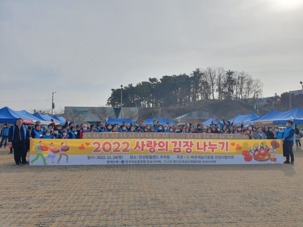 [금요저널] 안성시는 바르게살기운동 안성시협의회가 지난 24일 안성맞춤랜드 주차장에서 지역사회 소외계층을 위한 ‘2022년 사랑의 김장나누기’ 행사를 진행했다고 알렸다.