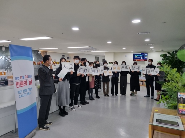 [금요저널] 의정부시 송산3동은 11월 24일 올바른 민원 문화를 조성하기 위해 올해 처음 지정된 ‘민원의 날’을 기념해 송산3동 공공복합청사 민원실에서 ‘제1회 민원의 날’ 캠페인을 실시했다.
