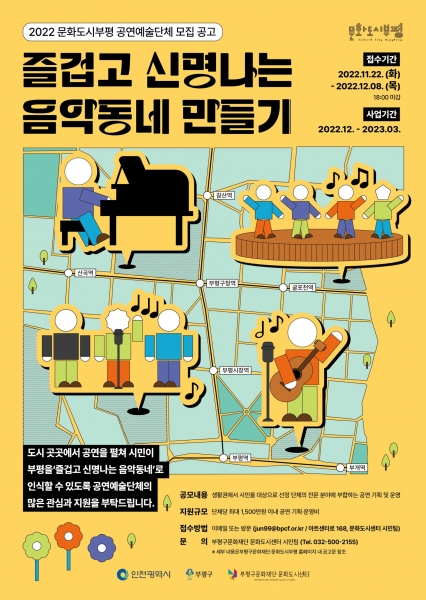 [금요저널] 부평구 문화도시센터가 오는 12월 8일까지 문화도시부평과 도시 곳곳에서 다양한 공연을 펼치며 부평구 전역을 ‘즐겁고 신명나는 음악동네’로 만들어 갈 전문 공연단체를 모집한다.
