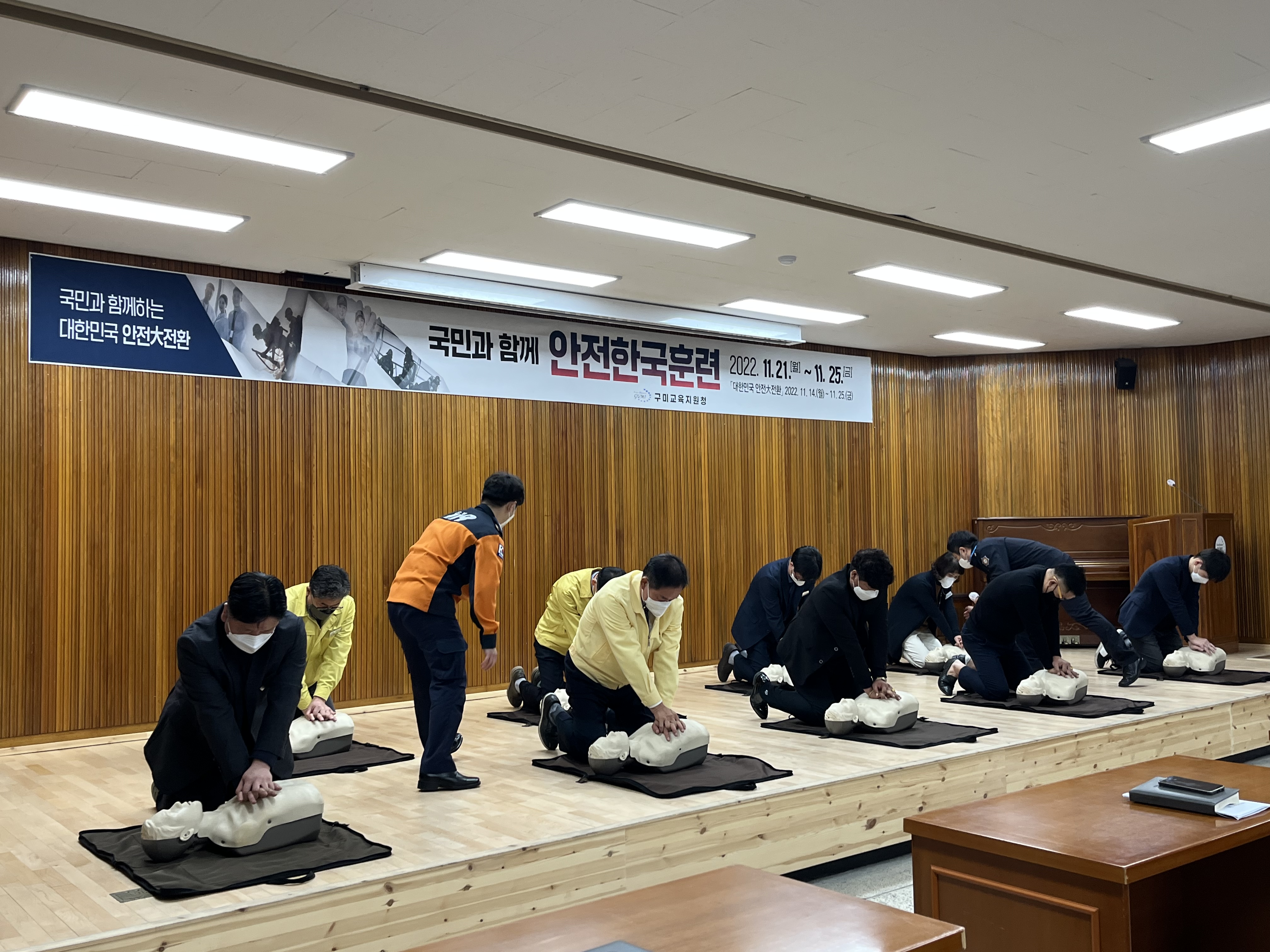 □ 구미교육지원청은 22일 구미소방서(예방안전과) 협조를 받아 학부모와 함께하는 심폐소생술 실습, 제세동기 사용법을 교육하였고, 교육장 주재로 코로나19 재유행을 가정한 감염병 발생에 따른 사고 수습 및 대책에 대한 토론훈련을 진행하였다.