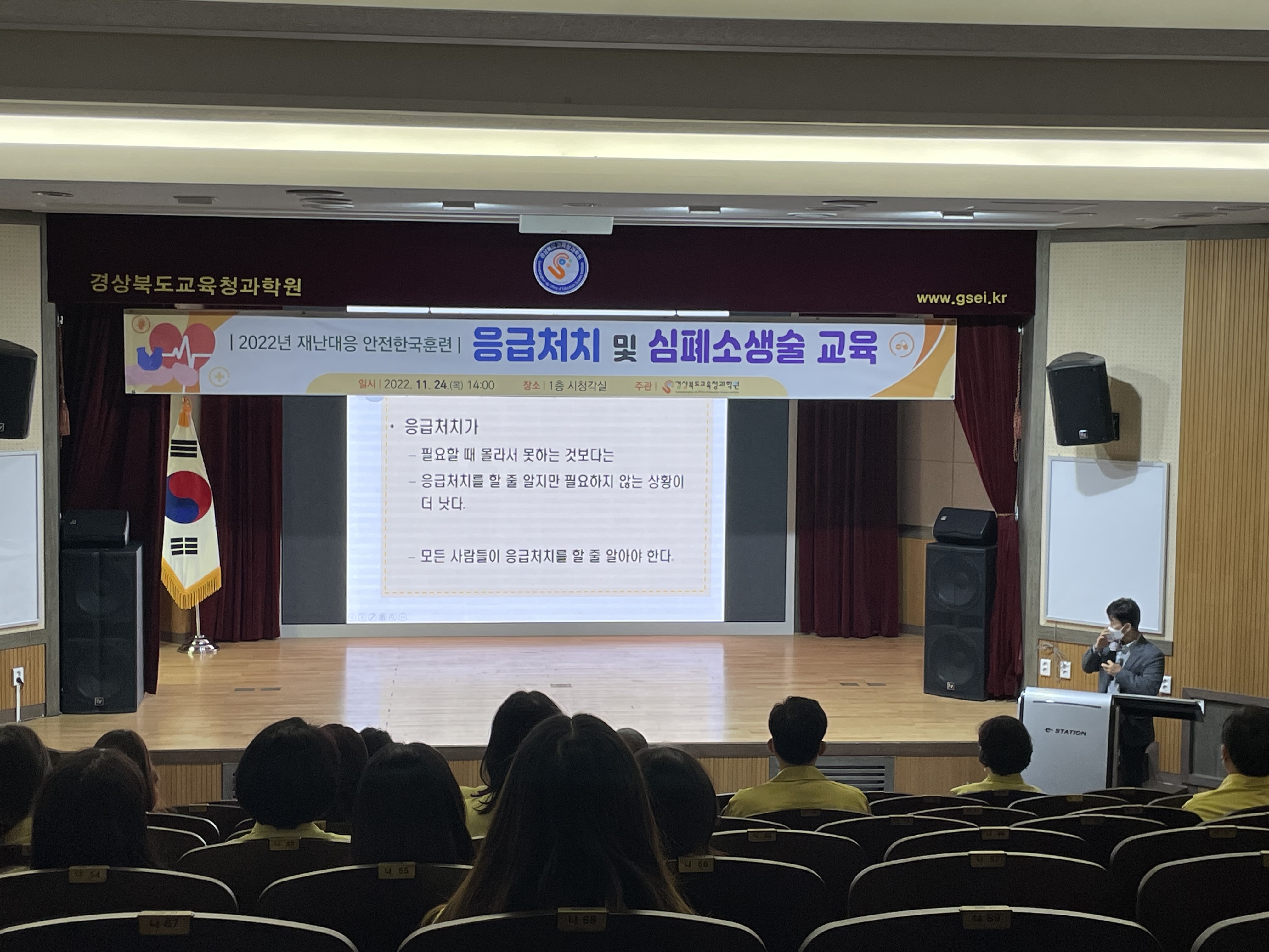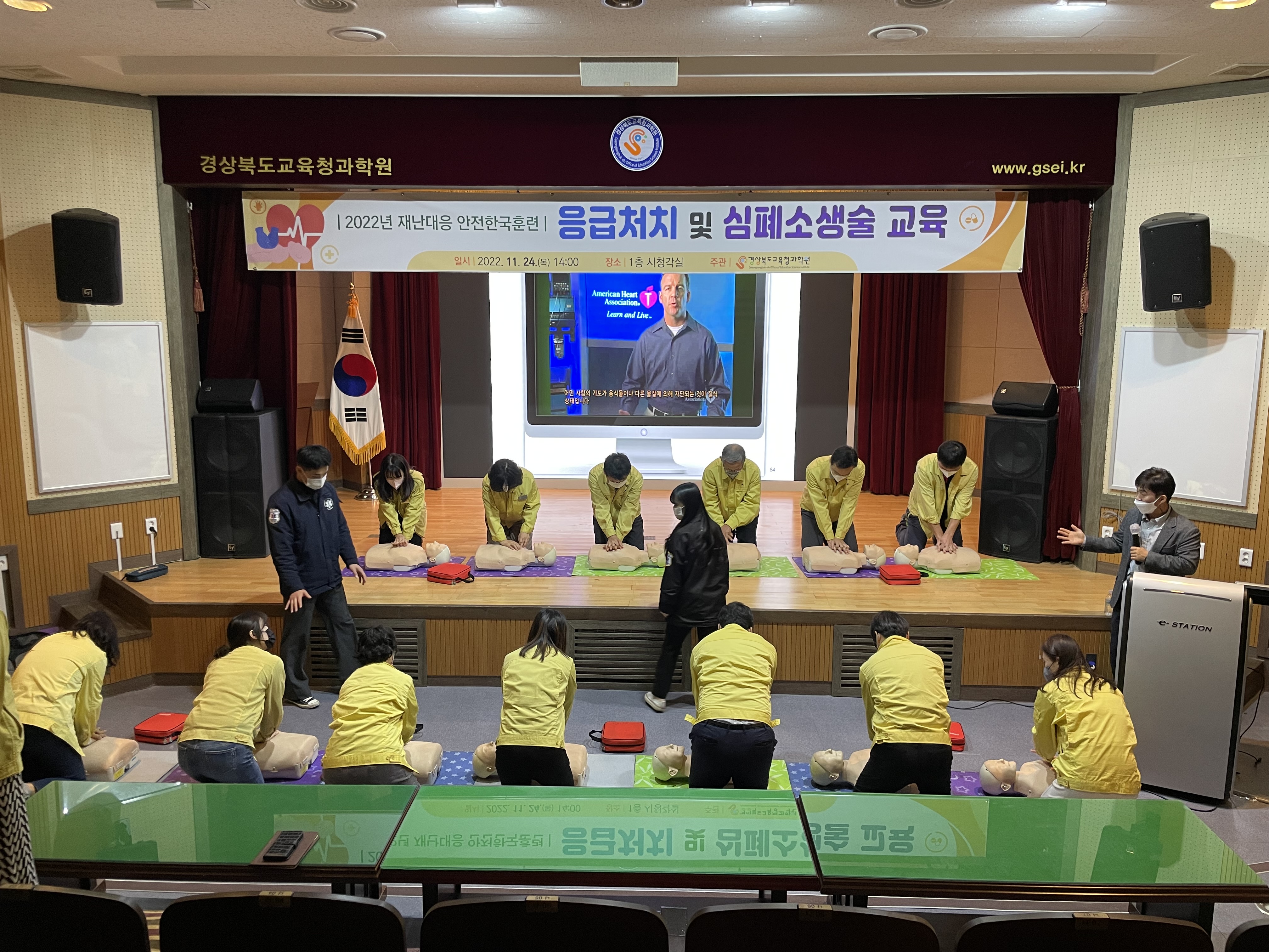 ❑ 경상북도교육청과학원(원장 이승수)은 11월 24일(목) 오후 2시부터 2022년 재난대응 안전한국훈련의 일환으로 교직원 대상 응급처치 및 심폐소생술 교육을 실시하였다.