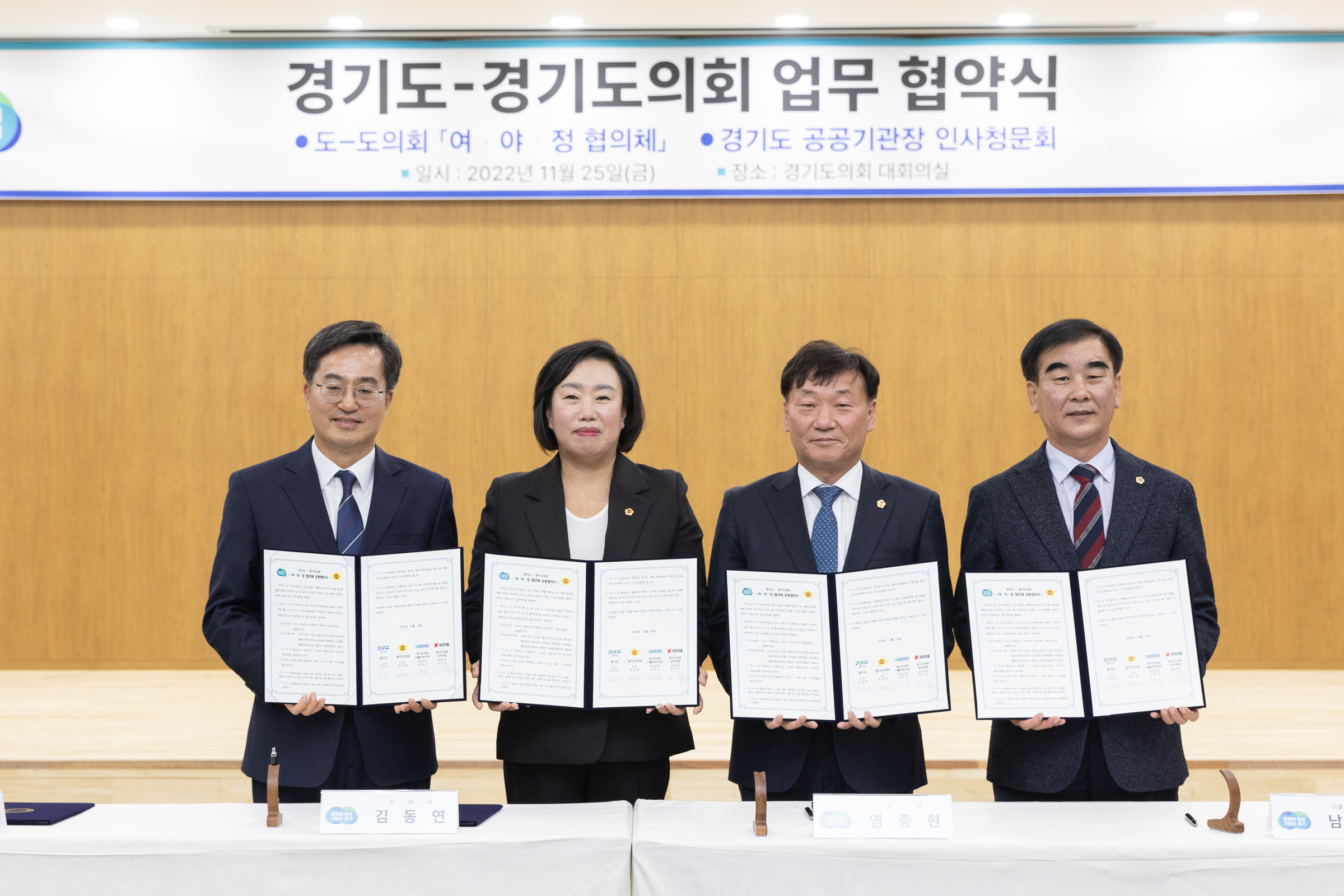 김동연 경기도지사와 염종현 경기도의회 의장, 더불어민주당 남종섭 대표의원, 국민의힘 곽미숙 대표의원은 25일 경기도의회 대회의실에서 이런 내용을 담은 ‘경기도-경기도의회 여·야·정 협의체 공동협약서’에 공동 서명하며 본격적인 ‘김동연표’ 정책협치, 민생협치의 출발을 알렸다.