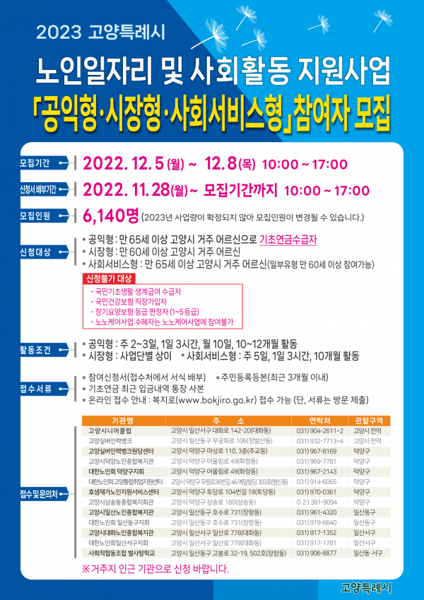 2023년 고양시 노인일자리 및 사회활동지원 사업은 총 208억원을 투입해 만 65세 이상 기초연금 수급 노인이 참여할 수 있는 공익활동형에 4,909명, 사회서비스형에 470명을 모집하고 만 60세 이상 기초연금 미수급 노인이 참여할 수 있는 시장형에 588명, 취업알선형에 173명을 모집할 예정이다.
