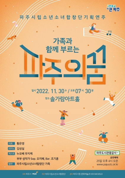 ‘가족과 함께 부르는 파주의 꿈’이라는 부제로 진행되는 이번 무대는 가족의 소중함과 따뜻함을 소년소녀합창단의 맑고 고운 합창으로 선보일 예정이다.