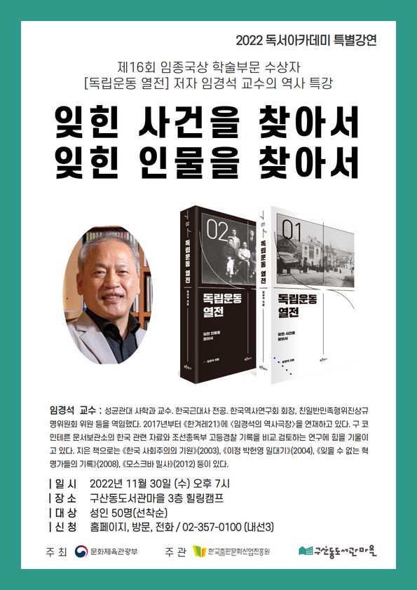 독서아카데미 특강 ‘잊힌 사건을 찾아서 잊힌 인물을 찾아서’는 오는 30일 저녁 7시 구산동도서관마을 3층 힐링캠프에서 진행된다.