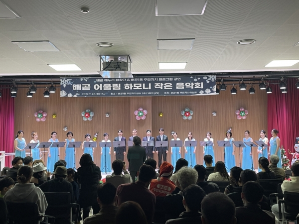[금요저널] 배곧1동은 지난 26일 동 행정복지센터 다목적강당에서 배곧1동 주민들과 함께하는 ‘배곧 어울림 하모니 작은 음악회’를 선보였다.