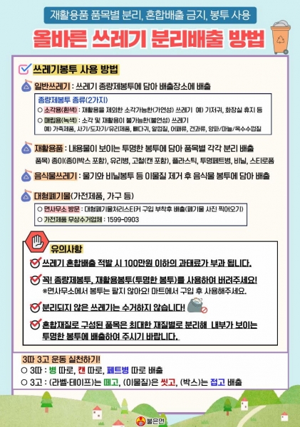 [금요저널] 강화군 불은면은 지난 25일 주민들에게 올바른 쓰레기 배출 방법을 알리기 위해 자체 분리배출 홍보지를 제작·배포했다.