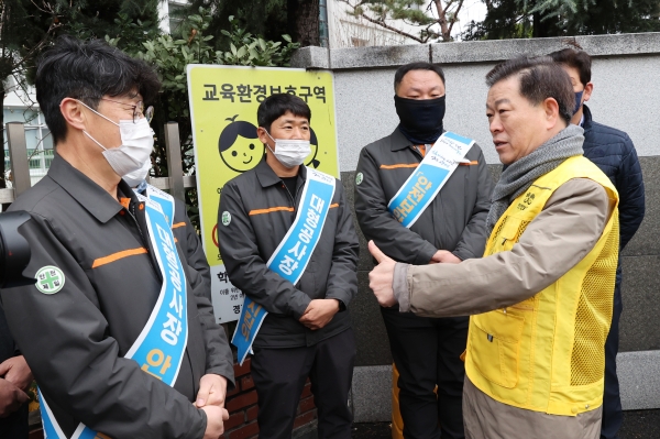 이날 박 시장은 광남중학교 앞 횡단보도에서 등교하는 학생들을 일일이 맞았으며 통학로 주변의 대형 공사 차량의 안전 운행 이행 여부와 교통 안전시설을 점검하고 학생 안전에 위협을 주는 적치물 등이 없는지 살펴보았다.