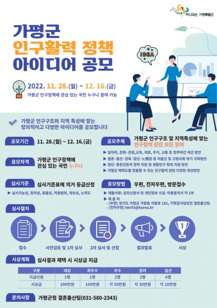공모주제는 가평군 인구구조 및 지역특성에 맞는 인구정책 관련 모든 분야로 일자리, 문화·관광, 교육, 의료, 주거, 교통 등 정주여건 개선 방안 결혼·출산·임신·양육·청년·노인 지원 등 저출산 및 고령사회 위기 극복 방안 청년·중장년 등의 정착 지원 및 생활인구 확대 지원 방안 가평군 매력도를 창출할 수 있는 인구활력 관련 다양한 개선방안 등이다.