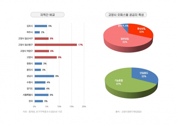 그 결과 고양시는 오피스텔 주거비중이 2021년 기준 9%로 전국, 서울, 경기와 비교하면 매우 높은 수치를 기록하고 있다.