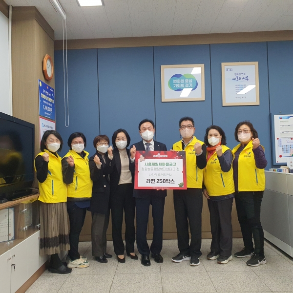 [금요저널] 시흥제일새마을금고는 연말연시를 맞아 지난 29일 정왕본동 행정복지센터를 방문해 관내 어려운 이웃을 위해 전달해 달라며 라면 20개입 250박스를 기탁하며 사랑을 전했다.