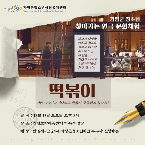 [금요저널] 가평군 청소년상담복지센터는 12월 17일 관내 청소년을 대상으로 ‘찾아가는 연극 문화체험’을 실시한다.
