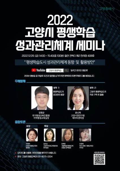 [금요저널] 고양특례시가 12월 9일 오후 2시 일산킨텍스 제2전시장 408호에서 ‘2022 고양시 평생학습 성과관리체계 세미나’를 온·오프라인 병행해 개최한다.
