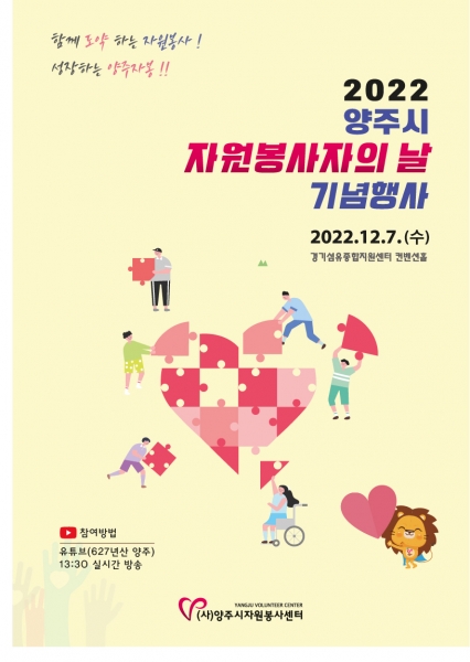 [금요저널] 양주시자원봉사센터는 오는 12월 7일 경기섬유종합지원센터 컨벤션홀에서 ‘2022 양주시 자원봉사자의 날 기념행사’를 개최한다.