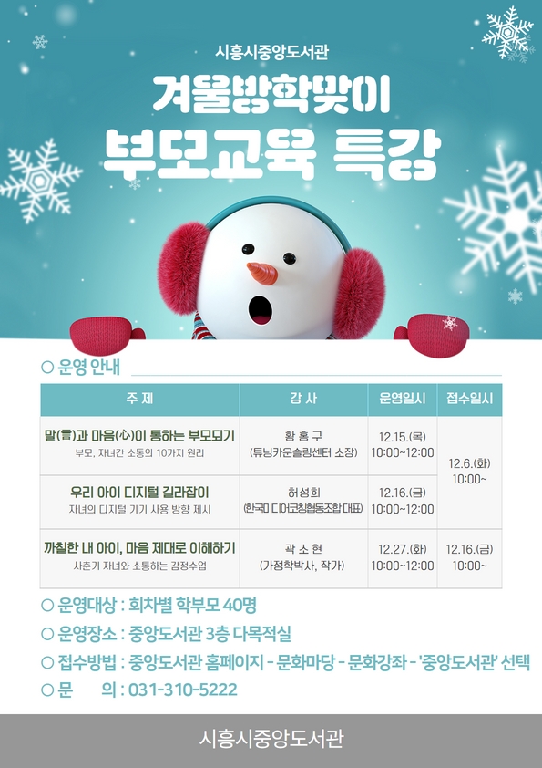 [금요저널] 시흥시중앙도서관은 겨울방학을 맞아 학부모와 자녀의 소통을 위한 ‘겨울방학맞이 부모교육’ 특강을 12월 15일 16일 27일 3회에 걸쳐 중앙도서관 3층 다목적실에서 운영한다.
