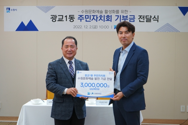이강혁 광교1동 주민자치회장은 “광교1동 주민자치회는 지난 2020년 수원문화재단과 업무협약을 체결하고 다양한 문화예술사업을 함께 이뤄왔다”며 “이번 기부금 전달식을 시작으로 우리 동네, 우리 지역의 문화예술 활성화를 위해 재단과 함께 고민하겠다”고 말했다.