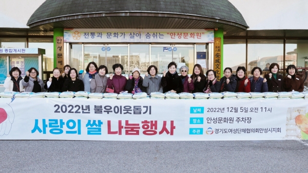 행사에 참석한 김보라 안성시장은 “기금마련부터 쌀 전달까지 몸을 사리지 않고 따뜻한 나눔을 실천해주시는 여성단체 회원분들이 있어 더불어 사는 풍요로운 안성만들기에 힘이 되고 있다”며 감사와 격려의 말을 전했다.