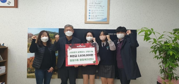 [금요저널] 서해중학교는 지난 5일 어려운 가정을 위해 써달라며 교내 바자회를 통해 얻은 수익금을 정왕3동 행정복지센터에 전달하는 사랑 나눔 활동을 펼쳤다.