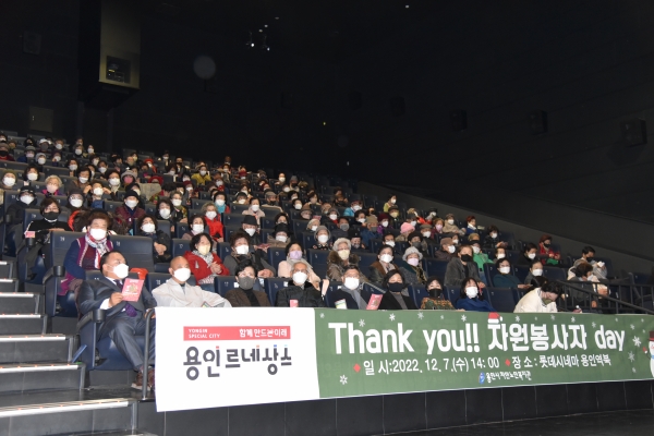 [금요저널] 용인시처인노인복지관에서는 7일 오후 1시 30분, 롯데시네마 용인역북점에서 자원봉사자 250명을 대상으로 송년 감사의 날 ‘Thank you 자원봉사자Day’를 진행했다.