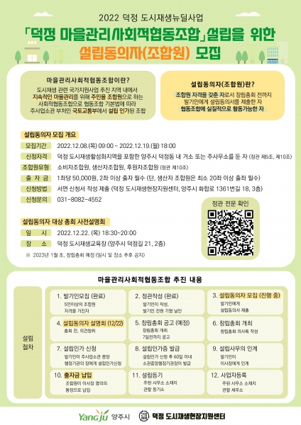 [금요저널] 양주시 덕정 도시재생현장지원센터는 오는 19일까지 ‘덕정 마을관리사회적협동조합’설립 동의자를 모집한다.
