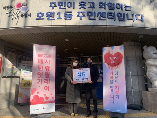 [금요저널] 의정부시 호원1동은 12월 7일 로체스터재활병원으로부터 성금 100만원을 기부받았다고 밝혔다.