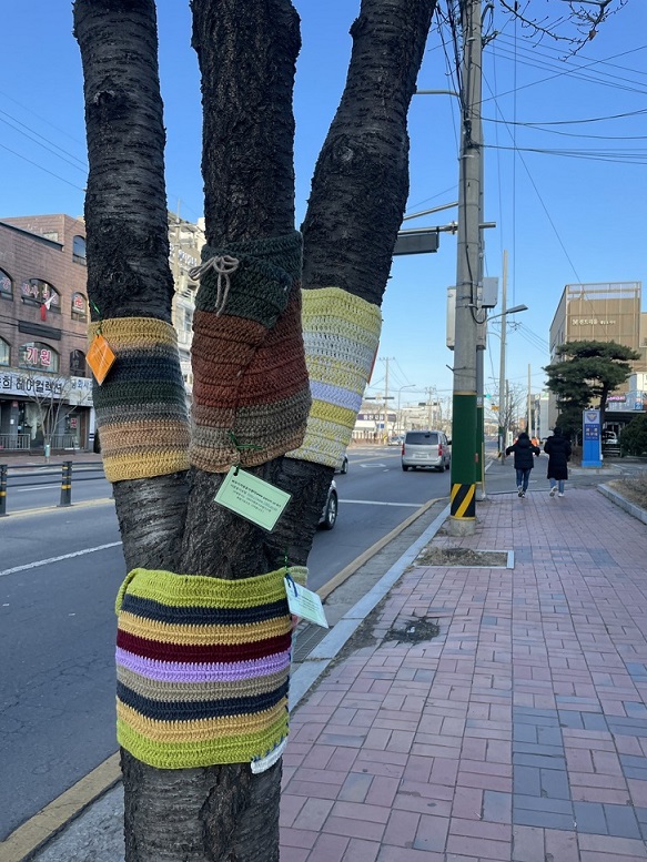이번 ‘나무에 옷을 입혀요’는 파주시자원봉사센터에서 추진한 가로수 니팅 프로그램으로 자원봉사자들이 여러 달에 걸쳐 손수 뜨개질한 70여 개의 뜨개옷을 모아 금촌역 인근 가로수에 씌웠다.