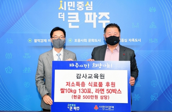 [금요저널] 파주시는 8일 감사교육원에서 파주시 취약계층을 위해 현금 500만원 상당의 쌀 1,300kg과 라면 50박스를 전달받았다고 밝혔다.