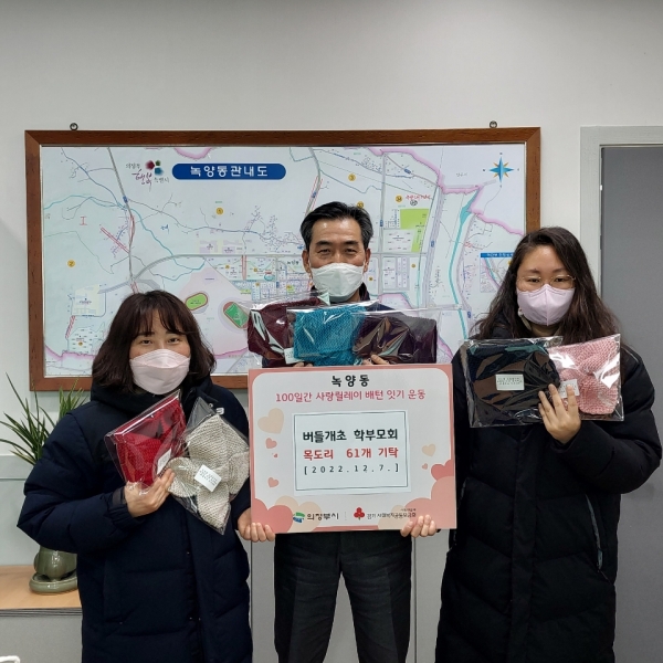 [금요저널] 의정부시 녹양동주민센터는 12월 7일 녹양동 버들개초등학교 학부모회 임원진이 학부모 40명이 함께 해 손뜨개질한 목도리 61개를 녹양동 어려운 이웃들에게 전달해 달라며 동주민센터에 기탁해 100일 릴레이 배턴을 이어갔다고 밝혔다.