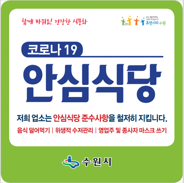 수원시 관계자는 “위생을 철저히 지키는 코로나19 안심식당이 많아지고 있다”며 “시민들이 편히 외식을 즐길 수 있기를 바란다”고 말했다.