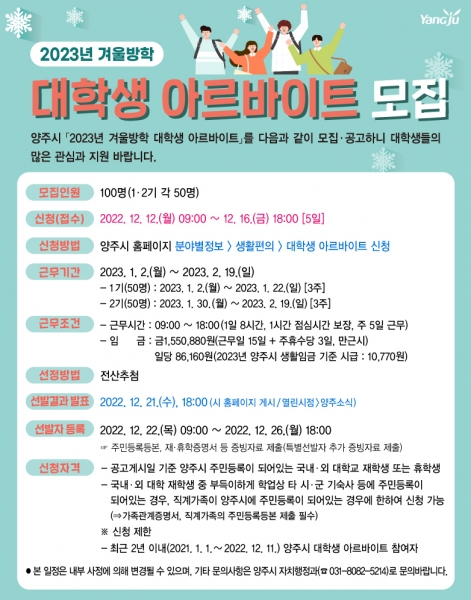 [금요저널] 양주시는 12일부터 오는 16일까지 2023년 겨울방학 대학생 아르바이트를 100명 모집한다.