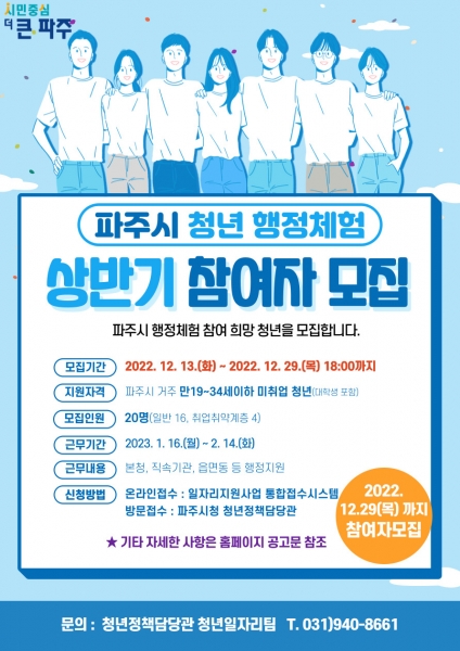 [금요저널] 파주시는 오는 29일까지 2023년 상반기 청년 행정체험 참여자 20명을 모집한다.