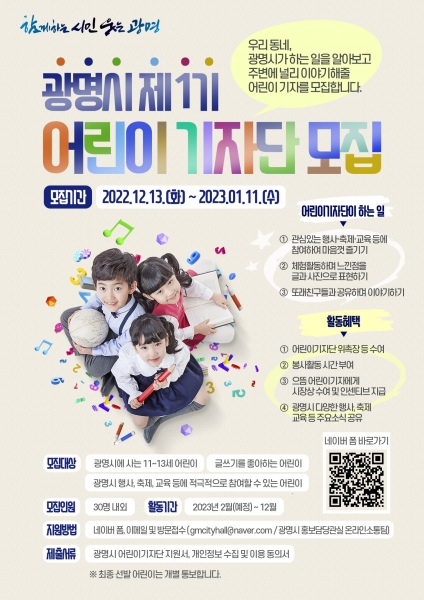 [금요저널] 광명시는 어린이들에게 광명시를 알리고 시정 홍보에 능동적으로 참여할 수 있는 기회를 제공하고자 광명시 제1기 어린이기자단을 내년 1월 11일까지 모집한다.