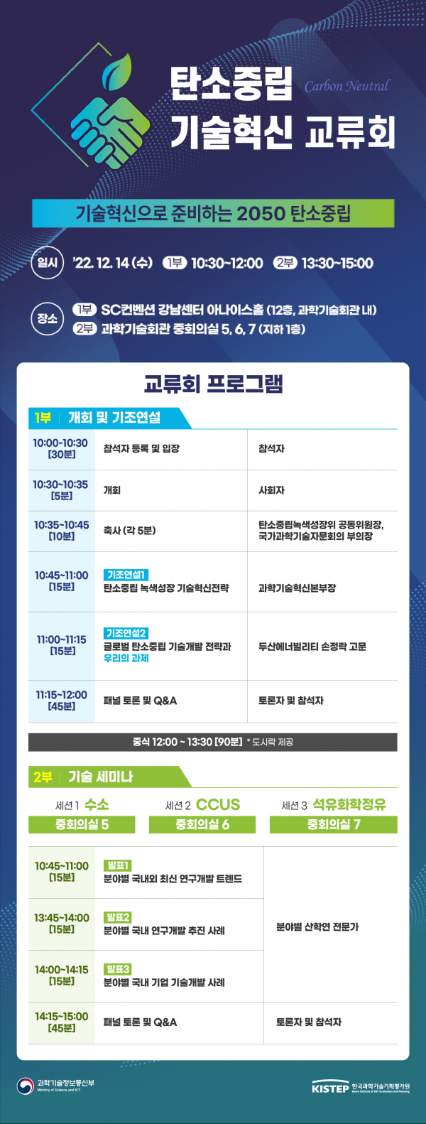 [금요저널] 과학기술정보통신부는 ‘기술혁신으로 준비하는 2050 탄소중립’을 주제로 ‘2022 탄소중립 기술혁신 교류회’를 12월 14일 과학기술회관에서 개최했다.