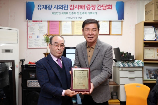 [금요저널] 수원특례시의회 유재광 의원은 14일 희성연인아파트 입주자대표회로부터 공공용지 개방 및 소방도로 확보 등에 적극 기여한 공로로 주민 감사패를 받았다.
