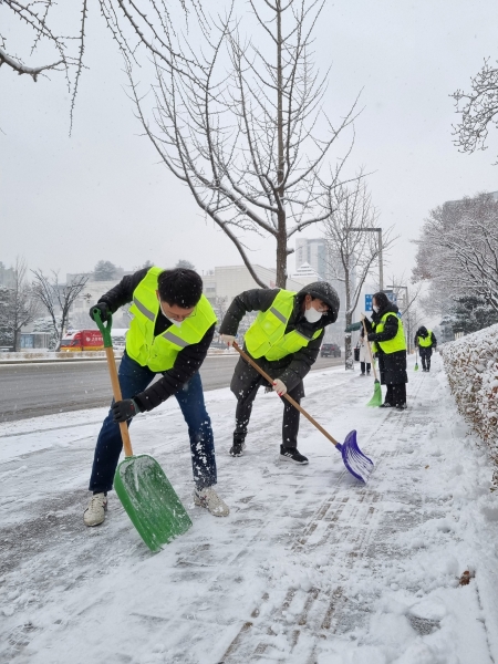 오후 3시부터 전 직원의 1/2이 담당 동에서 제설 작업을 하고 있다.