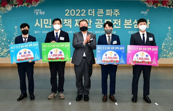 심사 결과 금상, 파주형 ‘다가치 보육’ 도입 은상, 파주시 1인 가구 지역 커뮤니티 조성 사업 동상, 파주관광안내센터 활성화 방안 장려상, 청년 금연 지원 정책으로 선정됐다.