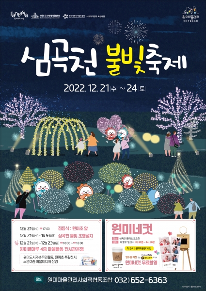 이번에 진행하는 행사는 심곡천 중 원미교~심곡교에 조명장식을 설치하며 시는 12월 21일 오후 5시에 심곡천 원미교에서 조용익 부천시장과 지역 주민 등 30여명이 참석한 가운데 점등식을 갖고 내년 1월 5일까지 점등에 들어간다고 밝혔다.