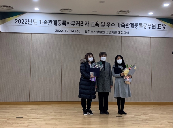[금요저널] 고양특례시 일산동구는 지난 14일 의정부지방법원 고양지원 대회의실에서 가족관계등록제도 발전과 정착에 기여한 공로를 인정받아 ‘2022년 우수 가족관계등록공무원 법원행정처장상’을 수상했다고 밝혔다.