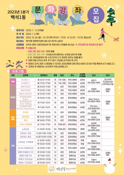 1분기 문화강좌는 내년 1월 2일부터 3개월간 진행되며 12월 26일부터 12월 29일까지 백석1동 행정복지센터에서 선착순으로 신청 가능하다.