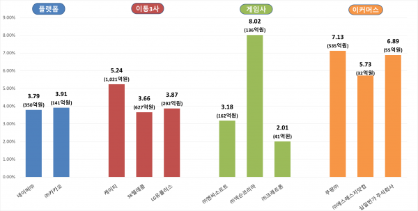 서비스별 주요 기업의 최고 정보보호 투자비중은 플랫폼 카카오 3.91%, 이통3사 케이티 5.24%, 게임사 넥슨코리아 8.02%, 전자상거래 쿠팡 7.13%이다.