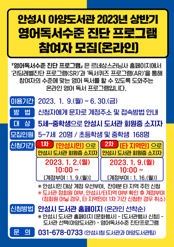 [금요저널] 안성시 아양도서관은 오는 2023년 1월 2일부터 유아, 초등학생 및 중학생을 대상으로 2023년 상반기 온라인 ‘영어독서수준 진단 프로그램’ 참여자 188명을 안성시 도서관 홈페이지를 통해 선착순 모집한다.