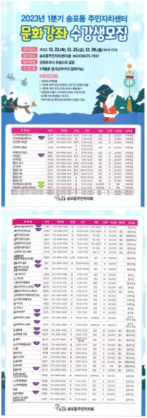 [금요저널] 고양특례시 일산서구 송포동 주민자치회는 12월 19일부터 2023년 1분기 주민자치센터 문화강좌 신규 수강생을 모집한다.
