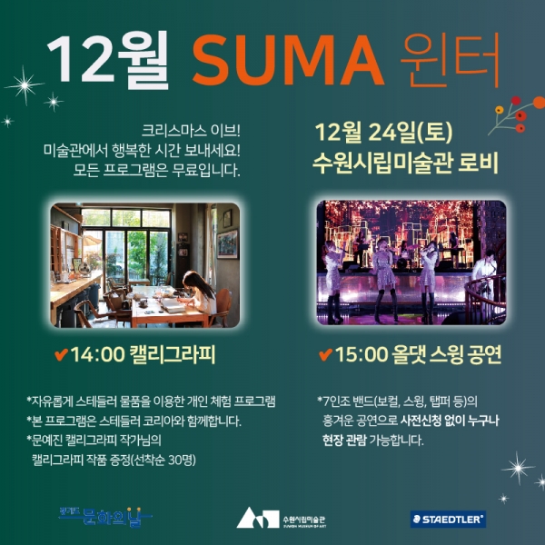 [금요저널] 수원시립미술관은 경기도 문화의 날과 연말을 맞아 시민들에게 다양한 문화 체험 기회를 위한 ‘SUMA 뮤지엄데이 윈터 페스티벌’을 12월 24일 오후 2시 수원시립미술관 로비에서 개최한다.
