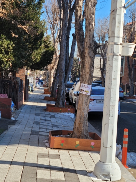 근처 주민들이 가로수 주변 흙이 무너져 내리는 것을 막기 위해 임시방편으로 벽돌이나 나무판을 쌓아놓았던 화단들이, 새롭게 설치된 가로수 보호틀로 깔끔하고 안정감 있는 모습으로 다시 태어났다.