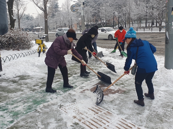 또한, 제설봉사단은 간선도로 상 보행로 외에도 제설차량 진입이 어려운 좁은 이면도로와 인도 등 제설 취약구역에 중점적으로 제설작업을 실시해 관내 제설작업에 큰 힘을 보탰다.
