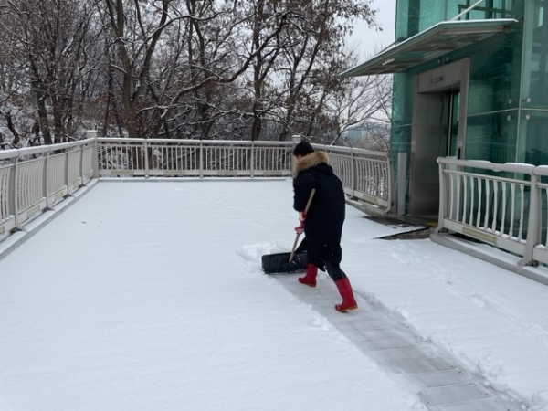 새벽에 내린 눈이 얼어 자칫 발생할 수 있는 낙상사고를 예방하기 위해 버스정류장과 육교 등 주요 결빙구간을 중심으로 신속히 길을 만들고 제설제를 살포했다.