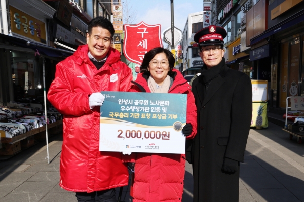 [금요저널] 안성시는 ‘2022년 공무원 노사문화 우수행정기관’ 시상식에서 받은 시상금 중 200만원을 23일 구세군 자선냄비에 기부했다.